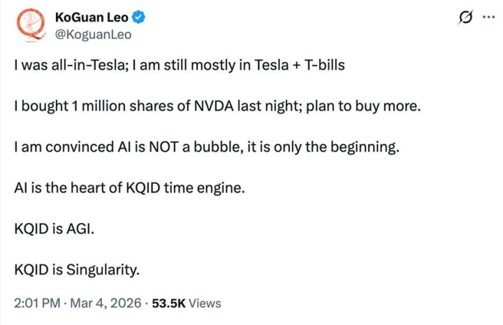 2026年3月4日,华侨富豪廖凯原(LeoKoGuan)在轻率平台X上告示,已买入100万股英伟达股票,耗资约1.8亿好意思元,并策动赓续增捏。